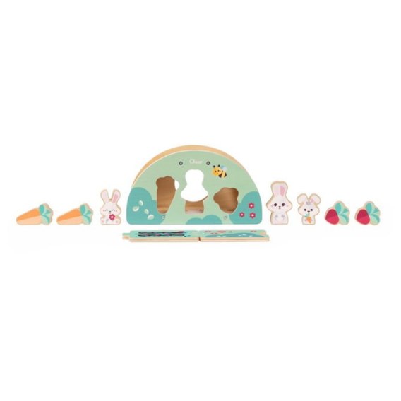 - Zawartość opakowania: 1 drewniana zabawka sortująca, 3 postacie króliczków, 2 marchewki, 2 buraki, 2 elementy ścieżki