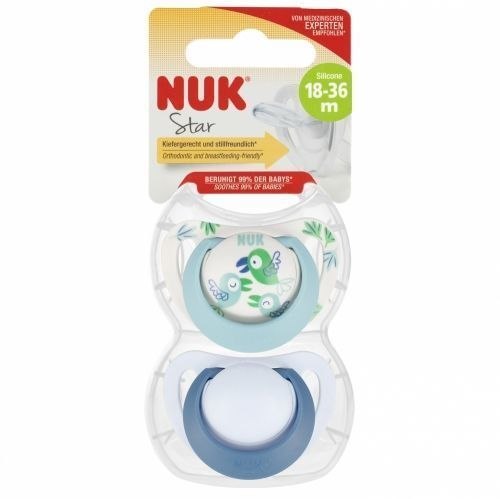 Niestety, niemowlęta nie mogą wyjaśnić, dlaczego kochają swój NUK Star tak bardzo. Ale podejrzewamy, że przyczyną jest miłe uczucie w buzi - górna część smoczka dopasowuje się delikatnie do podniebienia. Znajduje się tam miękka strefa, materiał smoczka jest bardzo cienki i wyjątkowo gładki. Jednocześnie dolna część smoczka pozostawia wystarczająco dużo miejsca dla naturalnych ruchów ssących. Ponieważ gumka smoczka jest wąska i spłaszczona, prawie nie ma nacisku na zęby oraz szczękę. W zestawie znajduje się wytrzymałe pudełko wielokrotnego użytku do bezpiecznego i czystego przechowywania. Występują w żółtym i czerwono-różowym kolorze. Opakowanie zawiera 2 sz. silikonowych smoczków od 18-36m wraz z pudełkiem. Wymiary/waga: wymiary opakowania (dł. x wys. x gł.)[cm]: 6x14x5, waga produktu w opakowaniu [kg]: 0,03 kg. Produkt przeznaczony dla dzieci w wieku: 18-36m. Pakowany w pudełeczko z zawieszką. Wyprodukowano w Niemczech.