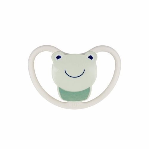 Smoczek uspokajający posiada ulepszony anatomiczny kształt wzorowany na kształcie brodawki sutkowej matki w czasie karmienia piersią, optymalnie dostosowuje się do jamy ustnej dziecka w czasie ssania. Bardziej spłaszczona i gładka od spodu gumka to przyjemne odczucie w buzi i więcej miejsca dla naturalnych ruchów ssących.