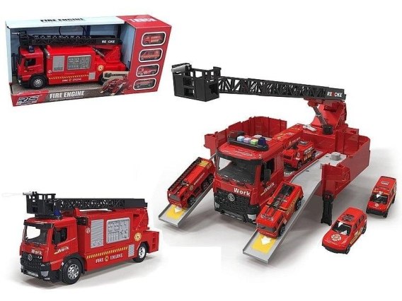 auto straży pożarnej, z rozkładaną naczepą, tworzącą parking, 4 autka, światło, dźwięk, drabina, bat.3xAG13 dołóćzone; 44x11x20cm, W/B