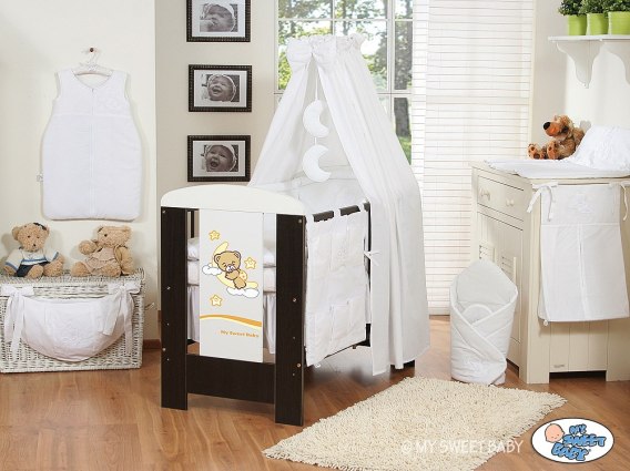 - Wiszące księzyce+ duża gruba kokarda - Dwa wiszące księżyce z miękkim wypełnieniem to słodkie i niepowtarzalne uzupełnienie kompletu pościeli. Idealnie pasują do do haftu z misiem znajdującym się na ochraniaczu, przyciągają uwagę dziecka w pierwszych miesiącach życia skutecznie zastępując karuzelkę. Duża gruba kokarda stanowi piękne zwieńczenie całości.