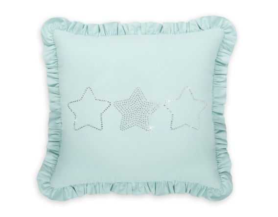 Elegancka kwadratowa poduszka, ozdobiona falbanką. Poszewka przyciąga wzrok migotliwą aplikacją wykonaną z drobnych cyrkonii na gładkiej tkaninie bawełnianej. Wypełniona tzw. sztucznym puchem, antyalergicznym. Sprawdzi się doskonałe jako dekoracja pokoju dziecięcego. Poduszka stanowi całość- poszewka nie jest rozbieralna. Stanowi piękny komplet z naszymi zestawami pościeli.