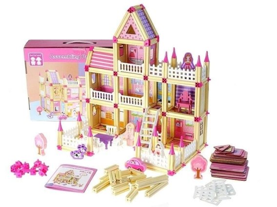 Domek drewniany dla lalek, 298 części, z figurkami i meblami, 3 poziomowy; 38x28x8cm, Box