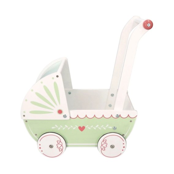 Stabilny drewniany wózek spacerowy z owalną budką w biało-miętowych barwach. Gumowane kółka, ergonomiczna rączka 46cm. Rozwija opiekuńczość i motorykę. Od 18m+. Certyfikat CE. Idealny prezent dla dziecka.