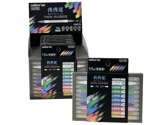 Flamastry dwustronne 10 kolorów metaliczne, cena za 1 blister.