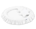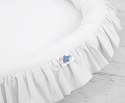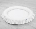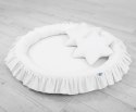 Oryginalne gniazdko z falbanką. Funkcjonalne i praktyczne. Doskonale sprawdzi się jako mini basenik, mata do zabawy lub "podłoga" baldachimu. Szerokie, okrągłe i mięciutkie ścianki zapewnią bezpieczną i udaną zabawę dla każdego malucha. Gniazdko może być używane już od pierwszych dni życia jako wygodny i bezpieczny kokon niemowlęcy a później jako przytulne miejsce do zabawy. Pokrowiec wykonany jest z tkaniny 100% bawełnianej, posiadającej atest Okotex. Boki gniazdka wypełnione są atestowanym włóknem Eco Fillball – mięciutkim włóknem uformowanym w malutkie kuleczki. Dzięki specjalnej technologii produkcji kuleczki te są puszyste i sprężyste, a przy tym w dotyku są miękkie i delikatne jak puch, zapewniają odpowiednią cyrkulację powietrza. Dno gniazdka, to specjalna wkładka wykonana z nowoczesnego antyalergicznego atestowanego surowca. Gniazdko łatwo utrzymać w czystości, pokrowiec jest rozbieralny - można prać w pralce w 30 stopniach.