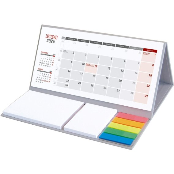 Praktyczny kalendarz stojący na biurko z przejrzystym kalendarium w układzie trzymiesięcznym. Poręczne samoprzylepne karteczki do notowania.