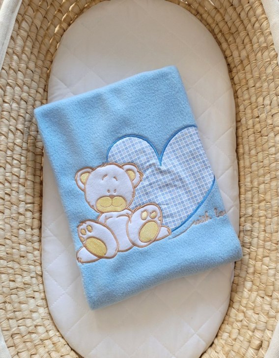 Kocyk polarowy dla niemowląt - Milo- Miś z sercem niebieski