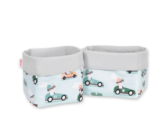 Komplet koszyczków na komodę 2szt. - zające w autkach miętowe