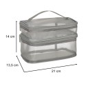 Praktyczna kosmetyczka podróżna - to must-have podczas każdej podroży. Dzięki dwupoziomowej konstrukcji umożliwia zorganizowanie kosmetyków. Jest zapinana na dwustronny zamek błyskawiczny. Wykonana z siateczkowego materiału ułatwiającego znalezienie schowanych produktów. Posiada praktyczną rączkę dla wygodnego przenoszenia.