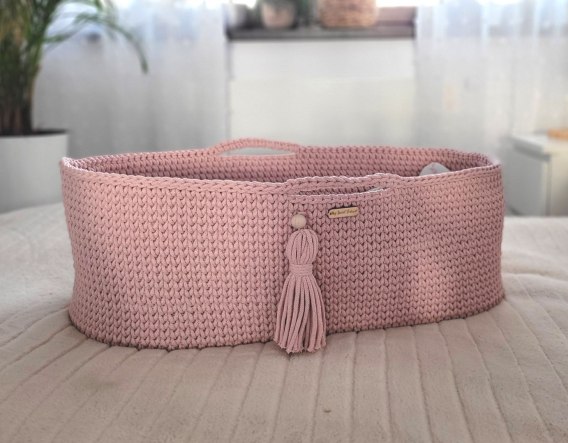 Kosz wykonany jest ręcznie ze sznurka bawełnianego. Miękkie wygodne pierwsze łóżeczko dla noworodka. Dzięki niewielkim wymiarom kosz Mojżesza może towarzyszyć rodzicom w każdym pokoju. Bawełniany sznurek z którego wypleciony jest kosz jest miękki, delikatny, a równocześnie bardzo stabilny. Ścieg szydełkowy wykorzystany w koszu jest lekko ażurowy, dzięki czemu zapewniona jest odpowiednia cyrkulacja powietrza. Dzięki uchwytom kosz Mojżesza można w łatwy sposób przenosić i mieć malucha zawsze blisko siebie. Dno kosza wykonane jest z solidnej drewnianej sklejki I jakości, o grubości 6 mm. Przy rączce znajduje się piękny, gruby, ręcznie robiony chwost w kolorze kosza, ozdobiony drewnianym koralikiem.