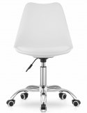 Nowoczesne krzesło obrotowe do biurka w kolorze białym, z miękką poduszką siedziska i chromowaną podstawą.