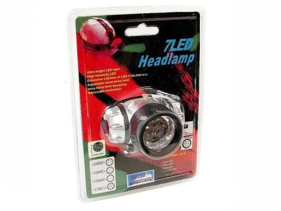 Latarka diodowa LED na czoło, 7 diod, 3 tryby świecenia, na baterie 3xAAA; 18x13x8,5cm, B/C