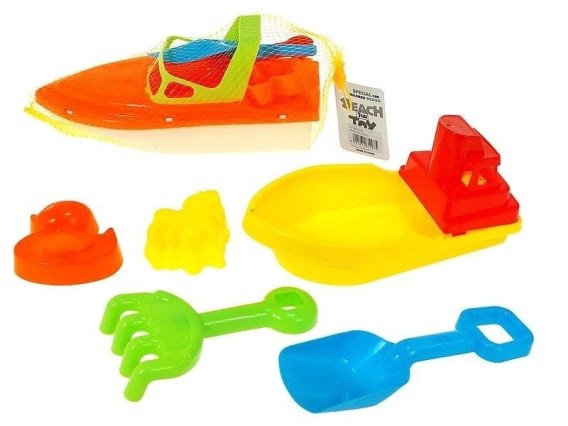 zabawki do piasku 5 części, łódka 25x12x10cm z foremkami, łopatka i grabki, display 12szt; 37x33,5x25cm, Box