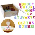 Alfabet i cyfry pakowane są w trwałe, drewniane pudełko co umożliwia łatwość w porządkowaniu i przechowywaniu elementów.