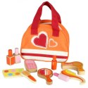 Uroczy zestaw drewnianych rekwizytów, dzięki którym dziewczynka będzie mogła udawać, że stylizuje włosy i paznokcie, oraz maluje twarz. Swoje kosmetyki będzie mogła zabrać ze sobą wszędzie, a to dzięki materiałowej torbie, która znajduje się w zestawie.