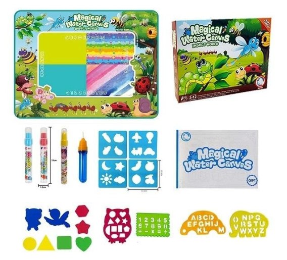 należy napełnić wodą dołączone mazaki, pomaluj mazakiem poszczególne elementy rysunku na macie, po skończonym kolorowaniu poczekaj kilka minut a rysunek na macie powróci do swojego pierwotnego stanu i będzie gotowy do ponownej zabawy. W zestawie szablony i inne akcesoria.