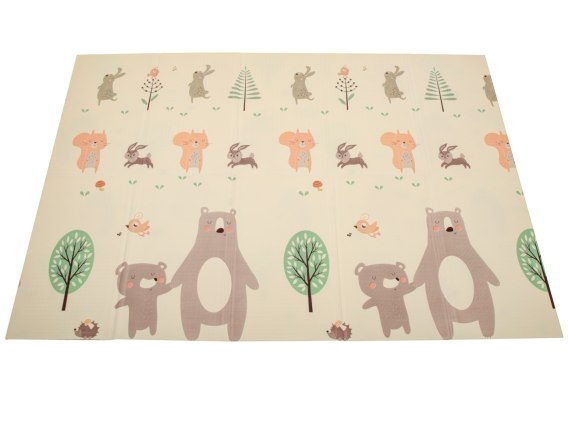 Mata posiada dwustronny nadruk: na pierwszej stronie znajduje się grafika przedstawiająca uroczego misia wraz z wiewiórką i króliczkami druga strona maty zawiera kolejne urocze zwierzątka - jeże i liski