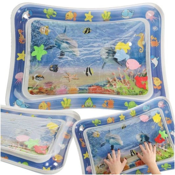 Wewnątrz maty zostały umieszczone kolorowe zwierzątka wodne, które będą przesuwać się pod wpływem ruchów dziecka.