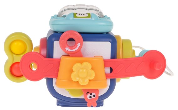 Multifunkcyjna, edukacyjna zabawka dla maluszków od 12-go miesiąca życia. Ta przenośna zabawka łączy w sobie wiele funkcji i nie pozwoli na nudę, wiele elementów jest do odkrycia i wiele umiejętności do wyćwiczenia. Maluszek może naciskać, obracać pokrętłami, przesuwać, dopasowywać, ciągnąć różne elementy zabawki , co stymuluje jego koordynację ręka-oko i ćwiczy małe rączki. Zabawka wykonana, z najlepszej jakości materiałów w żywych kolorach. Opis ścianek zabawki: Ścianka z wyskakującym pieskiem Maluszek naciska przycisk, otwiera się pokrywa i pojawia się piesek. Ścianka z obrotowym wałkiem z piłeczkami w środku Piłeczki umieszczone w przeźroczystym wałku przy poruszaniu wydają odgłosy grzechotania. Ścianka z pingwinkiem Maluszek naciska na przycisk, a pingwinek porusza oczkami i słychać odgłos piszczałki. Ścianka z gumową klamrą, ruchomym kwiatuszkiem i zajączkiem. Gumową klamrę możemy ciągnąć w lewo i prawo powodując poruszanie się kwiatuszka. Na tej ściance znajduje się również zajączek w łodzi z kołem ratunkowym. Poruszając kołem w lewo i w prawo powodujemy ruch kwiatuszka, a także zajączka. Ścianka z mechanizmem zegara i elementami do wciskania Podczas kręcenia śrubą słyszymy odgłos grzechotania. Na śrubie znajdują się również gumowe kółka do wciskania. Ścianka z kluczem otwierającym pokrywę Na sznureczku znajduje się kluczyk, po włożeniu go w otwór na pokrywie i przekręceniu, pokrywa otwiera się, a pod nią znajduje się wesoły obrazek z zajączkiem i pieskiem.  |