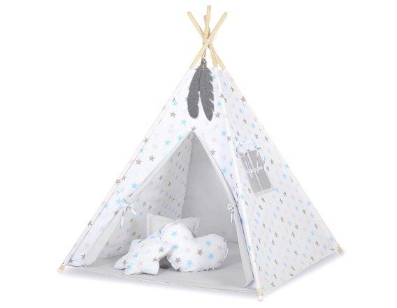Namiot TIPI dla dzieci +mata + zawieszki pióra - Gwiazdy szaro-niebieskie/szary