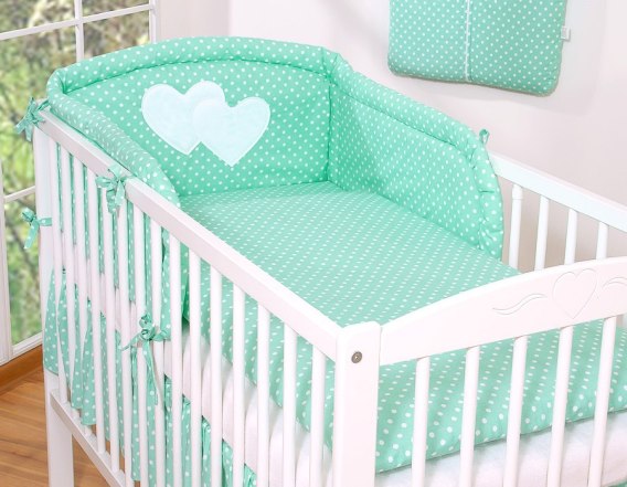 Pościel 2-cz Wiszące serduszka białe grochy na mięcie