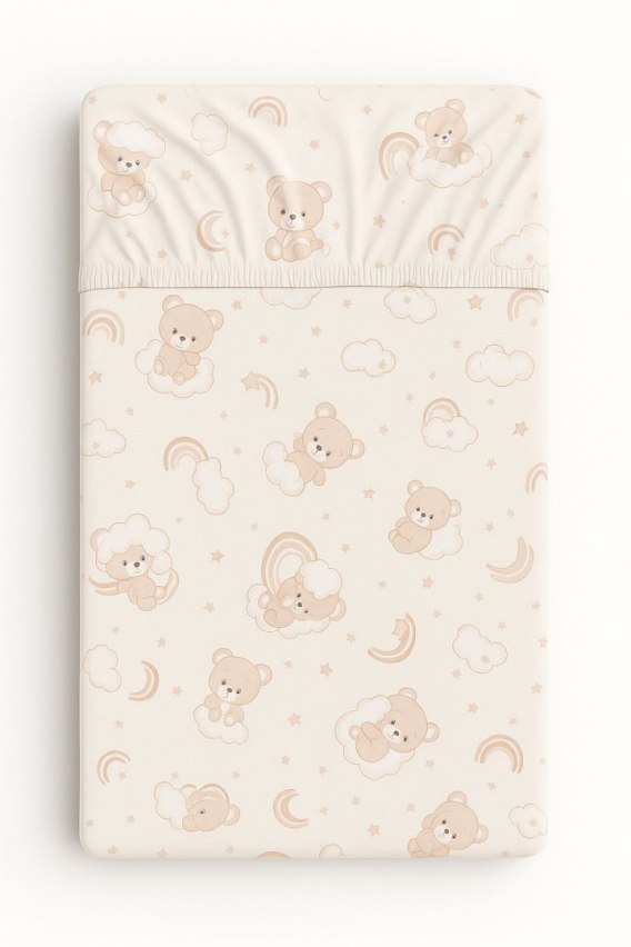 Prześcieradło bawełniane z gumką do łóżeczka 120x60 cm - beżowy miś z tęczą