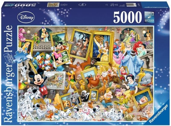 Puzzle 5000 elementów Ravensburger z postaciami Disneya, prezentują znanych i kultowych bohaterów bajek Disney w formie unikalnej układanki. Po ułożeniu puzzle mają wymiary 153 x 101 cm.