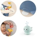 - - Zestaw zabawek znajdujących się na stoliku przed maluchem rozwija zdolności manualne oraz wyobraźnię Twojego dziecka: sitko w kształcie kwiatuszka, z którego leje się woda tworząc prysznic nad figurką, kubeczek do nabierania i wylewania wody, tryskającą wodą gumową rybkę.