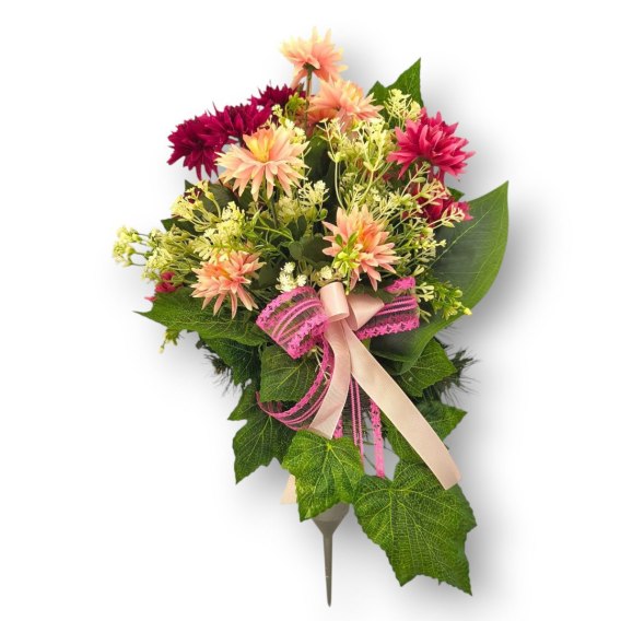 Estetyczny i trwały bukiet sztucznych kwiatów przeznaczony do wbijania w ziemię. Kompozycja umieszczona jest w wazonie na stabilnym plastikowym szpikulcu, co ułatwia umiejscowienie bukietu przy grobie, kapliczce lub krzyżu. Wazon jest obciążony betonem. Naturalny wygląd kwiatów oraz gustowny dodatek w postaci wstążki sprawiają, że dekoracja prezentuje się elegancko i schludnie przez długi czas - niezależnie od warunków atmosferycznych.