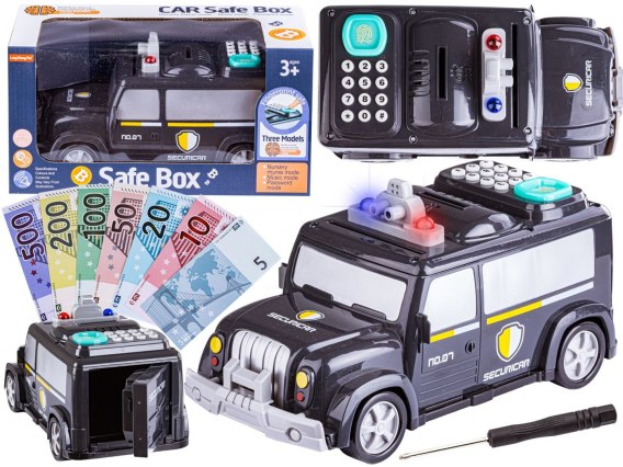 Wielofunkcyjna skarbonka wyglądająca jak prawdziwy samochód pancerny. Drzwi otwierane są tylko na kod, twoje oszczędności są więc bezpieczne. To wesoły i oryginalny sposób na przechowywanie pieniędzy.