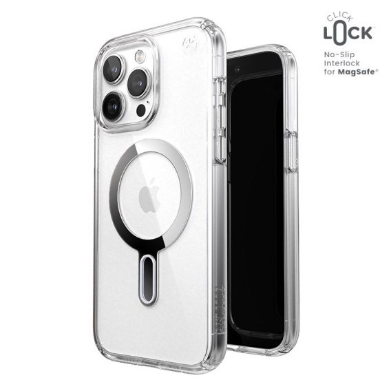 Speck Presidio® Perfect-Clear MagSafe® z technologią antypoślizgową ClickLock™ Interlock to przezroczyste etui z wbudowanym magnesem, kompatybilnym z akcesoriami Apple MagSafe®.