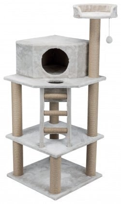 Drapak dla kota z pluszowym obiciem i słupkami owiniętymi jutą. Wyściełana platforma. Legowisko w środku wyłożone jest pluszem.