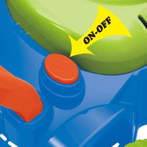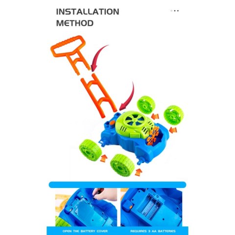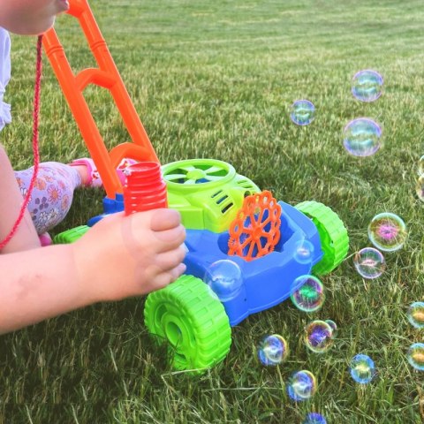 Bańki puszczane są automatycznieMały wiatraczek znajdujący się w górnej części obudowy silnika kosiarki, wytwarza strumień powietrza, który kierowany jest na 8 kręcących się pierścieni. Zanurzają się one w pojemniku na płyn do wytwarzania baniek i po kolei podsuwają pod małą dyszę. W ten sposób bańki puszczane są nieustannie. Dzięki 8 pierścieniom, zabawka wytwarza równocześnie dużą liczbę baniek. Dodatkową zaletą kosiarki są wydawane przez nią dźwięki. Dźwięki jakie możemy usłyszeć to dźwięk baniek mydlanych oraz melodia z bajki. Przy tylnych kółkach umieszczone zostały plastikowe zakładki, które podczas jazdy terkoczą imitując tym samym odgłos wydawany przez prawdziwe urządzenie. Bajecznie kolorowa kosiarka to propozycja niekończącej się  zabawy, pobudzającej kreatywność i rozwijającej zdolności manualne. Możesz mieć pewność, że maluch nie będzie miał czasu na nudę.
