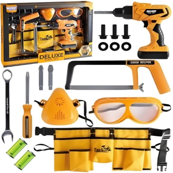 Zestaw Narzędzi Małego Majsterkowicza marki WOOPIE to kompletny zestaw narzędzi do zabawy w budowę:, okulary ochronne, pas na narzędzia, wkrętarka zasilana bateriami oraz narzędzia i elementy konstrukcyjne pobudzają wyobraźnię i zachęcają do twórczej zabawy w majsterkowanie. Realistyczne efekty zabawek oraz solidne dodają autentyczności i zapewniają długie godziny zabawy.
