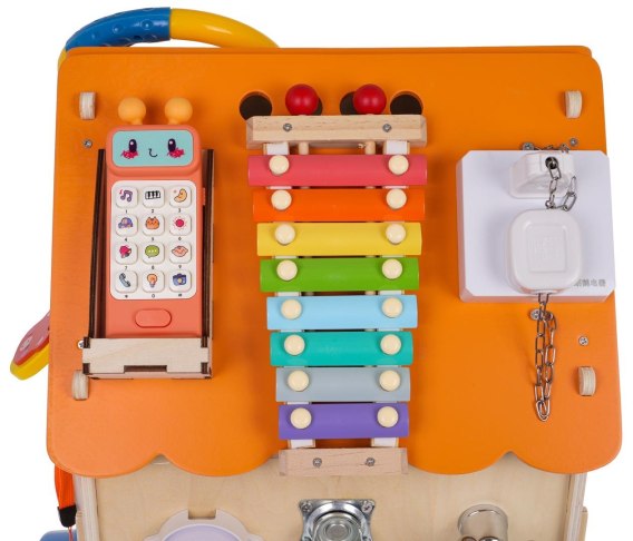 Wielofunkcyjny, drewniany domek z interaktywnymi funkcjami i zabawkami manipulacyjnymi. Na domku znajduje się aż 29 różnych atrakcji. Zabawka jest przeznaczona dla dzieci od 3-go roku życia. Konstrukcja wykonana jest z drewna i została pomalowana nietoksycznymi farbami. Solidne wykonanie i zaokrąglone krawędzie zapewniają bezpieczeństwo podczas zabawy. Oprócz drewnianego domku, w zestawie znajduje się wyjmowany telefon i plastikowa śruba z nakrętką. Domek posiada oświetlenie LED ukryte pod daszkiem. Poszczególne elementy, jak dzwonki, pozytywka i telefon posiadają funkcje dźwiękowe. Interaktywne funkcje są zasilane bateriami 7 x AAA 1,5V (w zestawie). Zabawa domkiem wszechstronnie rozwija dzieci i uczy posługiwania się popularnymi elementami codziennego użytku. Zabawki na dachu: - kolorowa, skrętna kierownica, - zamek błyskawiczny, - klamra z zatrzaskiem, - kołek z pętelką do zapięcia, - pasek z klamrą, - wyjmowany telefon z zielonym światełkiem i wesołymi dźwiękami pod każdym przyciskiem, - kolorolowe, metalowe cymbałki z 2 drewnianymi pałeczkami, - 2 wtyczki do kontaktów na łańcuszkach. Zabawki na ścianach przedniej i tylnej: - dzwon tradycyjny, - spinner do obracania, - drewniana kołatka, - pluszowy chomik z funkcją wibracji po naciągnięciu sznurka, - drewniany zegar wskazówkowy w kształcie królika z ruchomymi wskazówkami, - kołek z przyciskiem i mechanizmem przeskakiwania, - nakręcana pozytywka, - guziki do zapięcia i zamek błyskawiczny na filcowej kurteczce, - 3 koła zębate różnej wielkości, - otwierane drewniane drzwi z kluczami i 3 rodzajami zasuwek, - taśma ze światełkami LED z dotykowym włącznikiem. Zabawki na ścianach bocznych: - kurek od kranu do obracania, - kołowrotek z korbką i mechanizmem do kręcenia (podczas kręcenia słychać dźwięk przeskakiwania), - kółko meblowe, obrotowe o 360 stopni, - włącznik światła z lampką, - duży przycisk wydający odgłos klikania, - dzwonek recepcyjny, - mechanizm klikający ze sznurkiem, - zasuwka, - dzwonek elektryczny do drzwi. Specyfikacja: - domek z 29 zabawkami manipulacyjnymi, - osobno w zestawie wyjmowany telefon i śruba z nakrętką, - funkcje dźwiękowe w telefonie, dzwonku i pozytywce, - światełka LED pod daszkiem, - domek wykonany z drewna malowanego nietoksycznymi farbami, - stabilna konstrukcja i zaokrąglone krawędzie dla bezpieczeństwa, - przeznaczony dla dzieci od 3-go roku życia. |