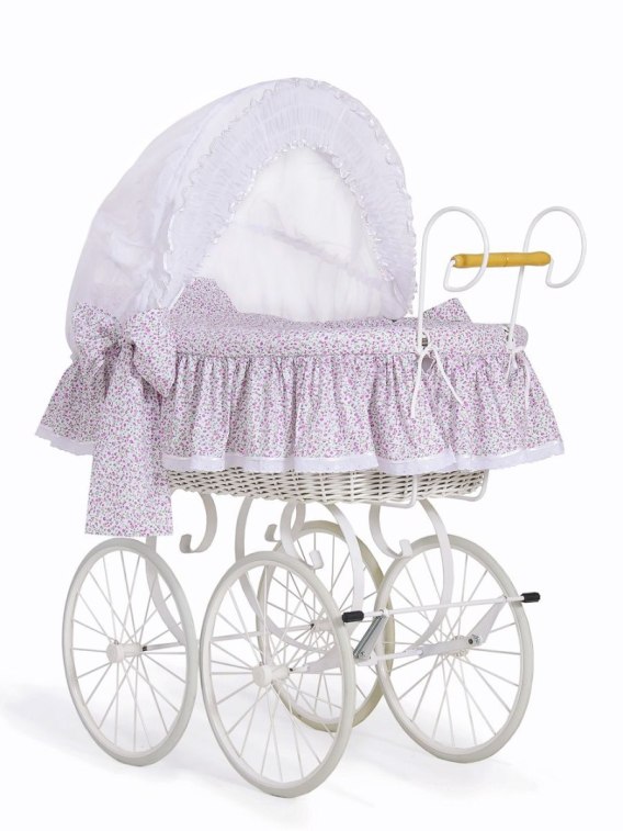 Wiklinowy kosz Mojżesza Retro ze składaną budką Jasmine - biały + różowa pościel z koronką