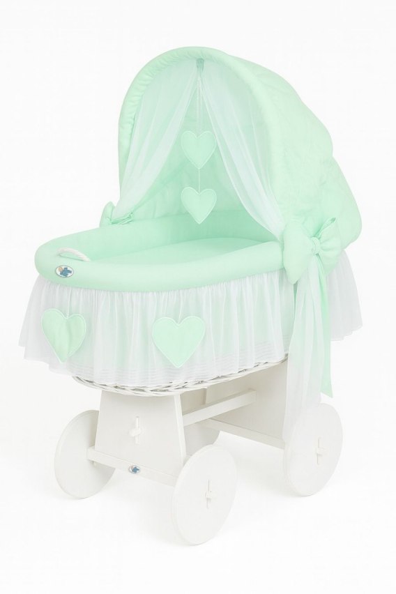 Wiklinowy kosz Mojżesza ze składaną budką Amelia - biały + miętowa pościel