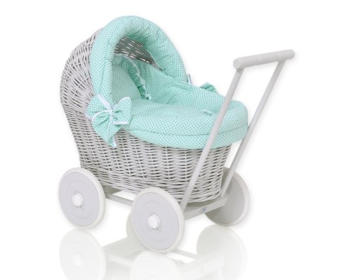 Wiklinowy wózek dla lalek pchacz szary z miętową pościelką i miękką wyściółką