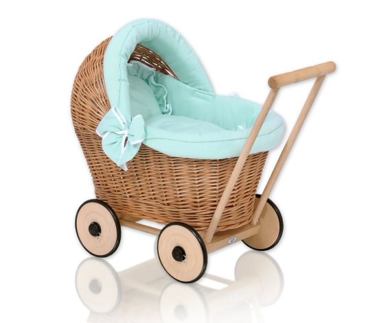 Wiklinowy wózek dla lalek pchacz z miętową pościelką i miękką wyściółką- naturalny