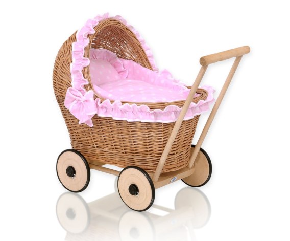 Wiklinowy wózek dla lalek pchacz z różową pościelką i miękką wyściółką- naturalny