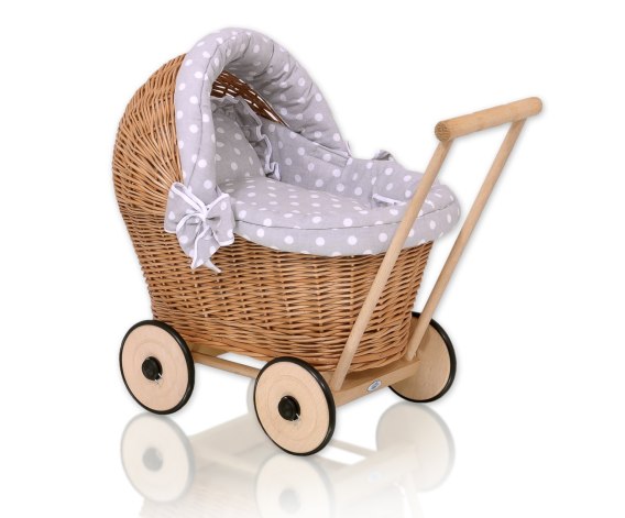 Wiklinowy wózek dla lalek pchacz z szarą pościelką i miękką wyściółką- naturalny