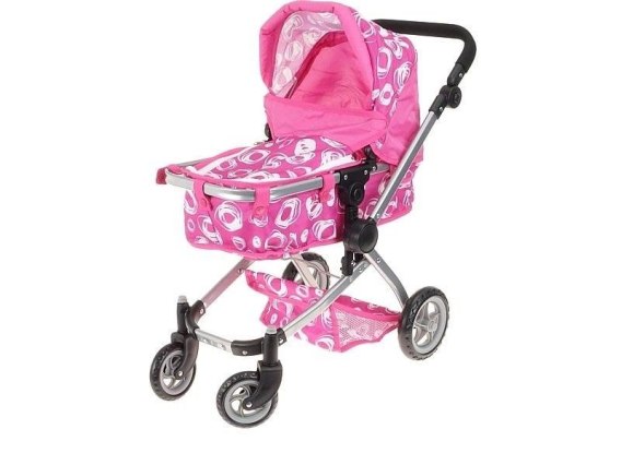Wózek dla lalek, głęboki, obrotowe kółka, składany daszek, regulowana i przekładana rączka, z koszem, funkcja spacerówki, nosidełko, torba.