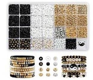 zestaw do robienia bransoletek, koraliki czarne, białe, złote i srebrne, aplikacje, literki, sznurki; Box