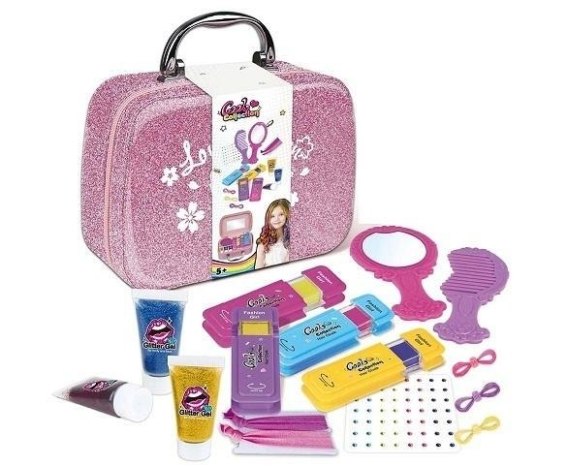Zestaw piękności z kredą do włosów w kuferku. Luksusowy brokatowy kuferek zamykany jest na zamek błyskawiczny. Zestaw zawiera kolorowe kredy do włosów oraz inne akcesoria do ozdabiania włosów.
